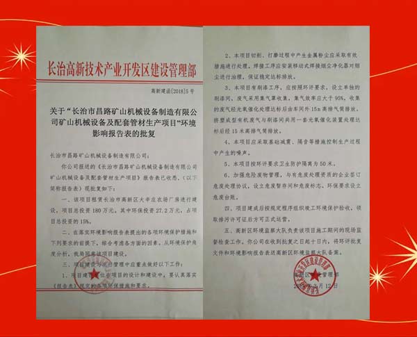 榮獲長治高新區(qū)環(huán)境影響報告表的批復(fù)