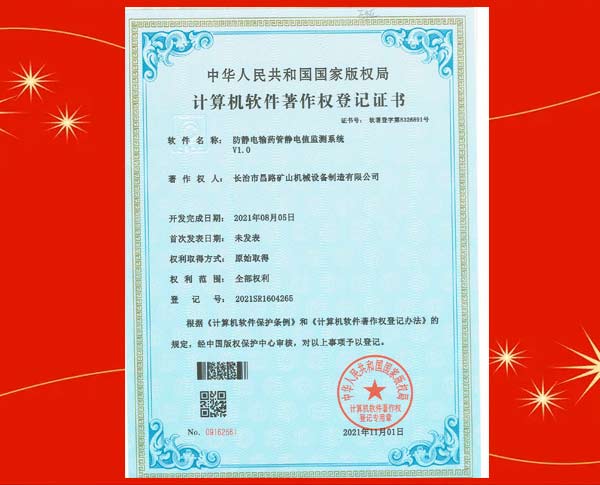 榮獲防靜電輸藥管靜電值監(jiān)測系統(tǒng)著作權(quán)登記證書