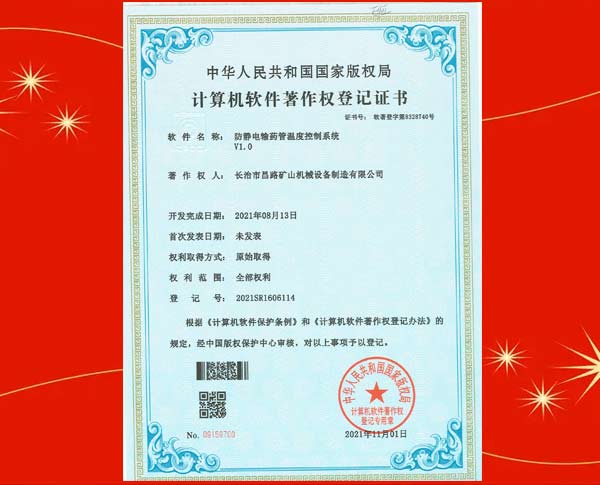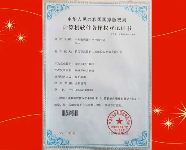 榮獲裝藥器生產(chǎn)控制平臺著作權(quán)登記證書